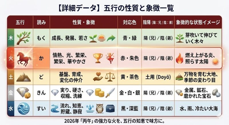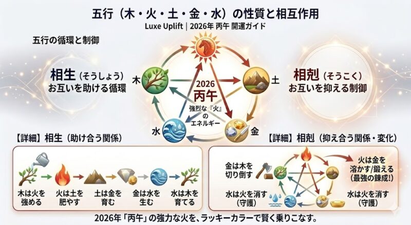 2026年の強烈な「火」の正体を知ったところで、そのエネルギーが具体的にどう作用するのか、東洋占術の根幹思想である「五行思想(ごぎょう思想)」を用いて深く解説します。