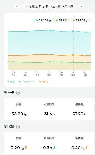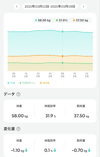 「また増えてる!」けれど、筋肉量は 37.40kg とガッチリキープできているので、基礎代謝は落ちていないことがわかります。だから、焦らなくていいのです。