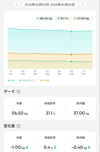 前週の微増(月のもの・油断)を乗り越えて、またグンと落ち始めました。変化量のところに、力強い青い下向き矢印が3つ並んでいますね。