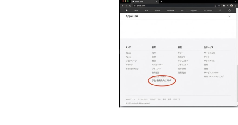 ギフトカードの準備が整ったら、Apple公式サイトへ。 ここで重要なのは、一般の入り口ではなく、フッター(ページ最下部)にひっそりと用意された「学生・教職員向けストア」からアクセスすることです。ここから入るだけで、MacBook Airの価格が自動的に数千円お安くなります。